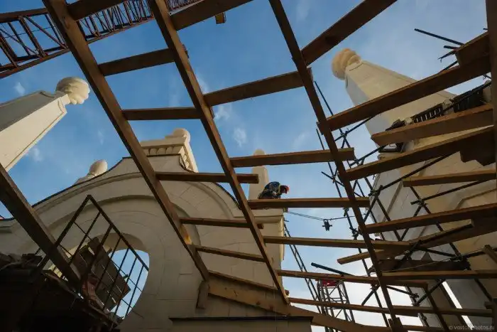 Процесс реставрации скульптур на правом крыле здания. Они стояли 60 лет под открытым небом, некоторые фрагменты фигур потрескались и раскрошились. Скульптуры были разобраны на части (в той последовательности, как и создавались), и перевезены для восстановления в мастерскую.