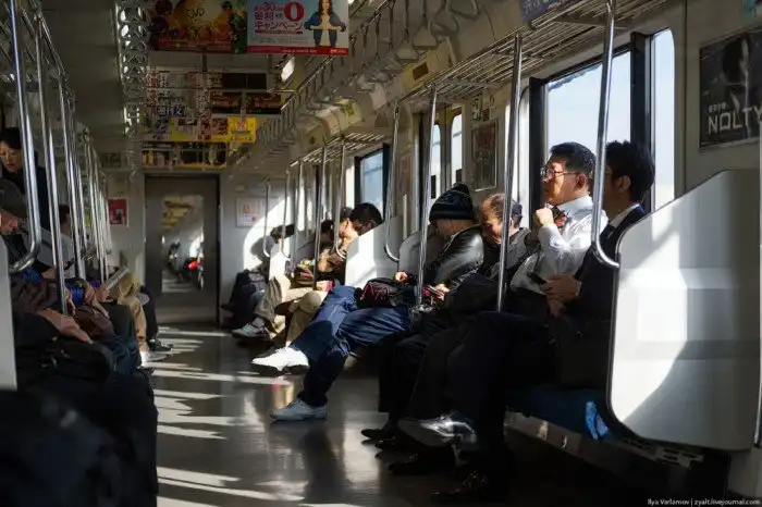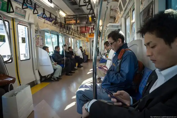 Комфортабельностью отличаются не только станции, но и сами вагоны метро. Зимой все сидения подогреваются, летом – вагоны обязательно кондиционируются. Несмотря на то, что после землетрясения Япония живет в режиме экономии энергии, в самую жаркую летнюю пору в вагоне можно сильно замерзнуть, если, конечно, вы не “сарариман” в пиджаке и галстуке. Для пожилых людей, да и просто тех, кому холодно, есть вагоны слабого кондиционирования. В них к потолку подвешен обычный вентилятор.