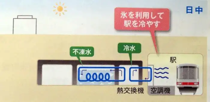 Интересная особенность некоторых токийских метро-станций – система охлаждения воздуха при помощи льда. Внутри станции есть специальные помещения с резервуарами, в которых за ночь замораживают лёд и на следующий день используют для кондиционирования воздуха внутри станции. Такая система помогает значительно сократить затраты электроэнергии.