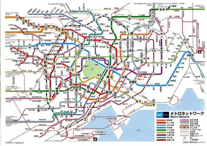 В Токийском метро 13 веток, каждая обозначена своим цветом и латинской буквой.