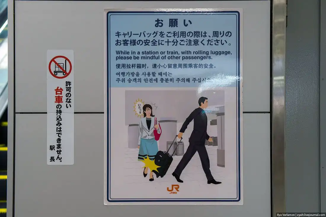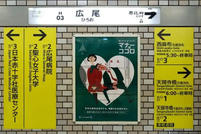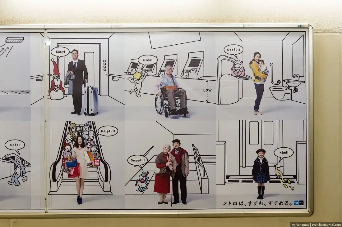 Большое внимание уделяется вопросу манер в метро. Буквально на каждом шагу и в каждом вагоне размещают довольно симпатичные плакаты, иллюстрирующие как делать не нужно. Плакаты выпускают новые каждый месяц, можно собрать целую художественную галлерею.