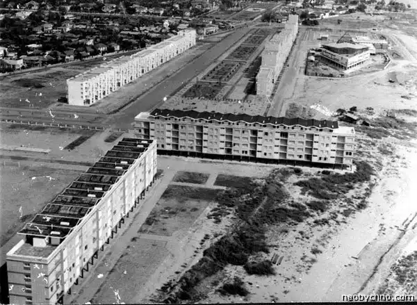 Так это здание выглядело в конце шестидесятых. В сети мало фотографий, потому и разрешение маленькое. Несколько однотипных зданий, составляющих один жилой квартал, были построены в 1963 году на берегу реки Бассак. Архитектором был француз русского происхожения, Владимир Бодянский. Работали они вместе с знаменитым Ле Корбюзье, который поспособствовал созданию наших советских “хрущёвок”.