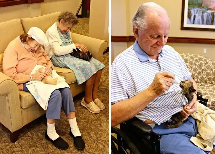 Дом престарелых, где пожилые люди ухаживают за бездомными животными.