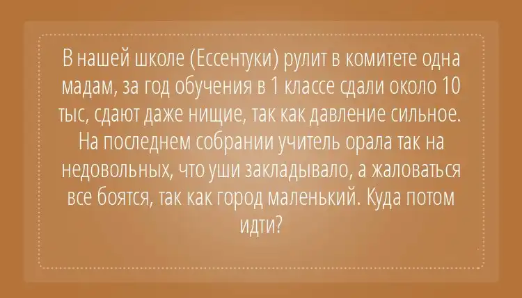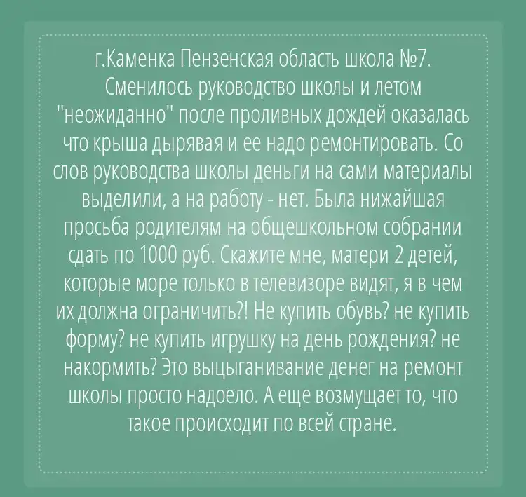 Моя знакомая только вчера пожаловалась - сдали ко дню учителя на подарок учителям по 500 рублей, а сейчас родительский комитет собирает на подарки к Новому году, уже по 1000. Знакомая причитает - где я возьму ту тысячу, мне бы кто подарил такой подарок, хотя бы рублей на 500, полгода не могу сходить к зубному врачу - ни копейки из бюджета не выделить, а тут подарки. И главное, что бОльшая половина класса приняла этот посыл с восторгом, а те, кто хоть как-то пытался противиться, одариваются весьма недвусмысленными взглядами и фырканиями. И все молчат, боятся за детей, что им будут занижать оценки и всячески третировать, как учителя, так и одноклассники, с посылом от их родителей. При этом мы сдали на ремонт класса, ежемесячно сдаем на всякие классные нужды - воду в кулере, салфетки, мыло и прочую хозяйственную мелочь. нет вопросов - это нужно. Но подарки? Ремонт?