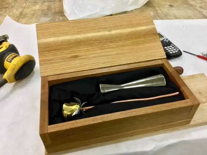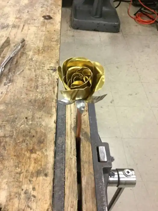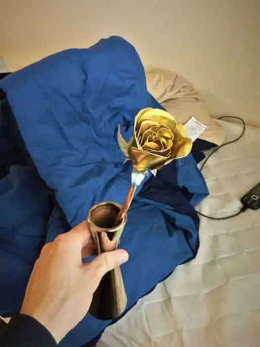 Чтобы подарить своей возлюбленной оригинальный и красивый подарок вовсе не нужно быть миллионером, достаточно иметь желание и прямые руки. Перед вами «золотая» роза, которую парень изготовил из латуни, тонкой стали и медной трубки. Сувенир он уложил в самодельную коробку из дуба и преподнес своей девушке, которая не могла не оценить все его старания.