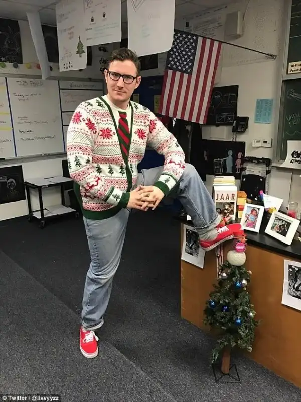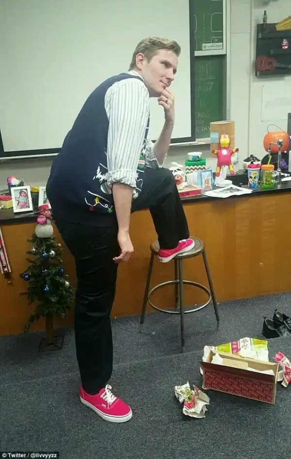 Старшеклассники из школы Эджвуд в Калифорнии подготовили отличный праздничный подарок любимому учителю. Группа школьников, сбросившись, подарила ему модные красные кеды Vans. Несколькими месяцами раньше, в начале учебного года, он похвалил такие же кеды на одном из учеников - и ребята запомнили это.