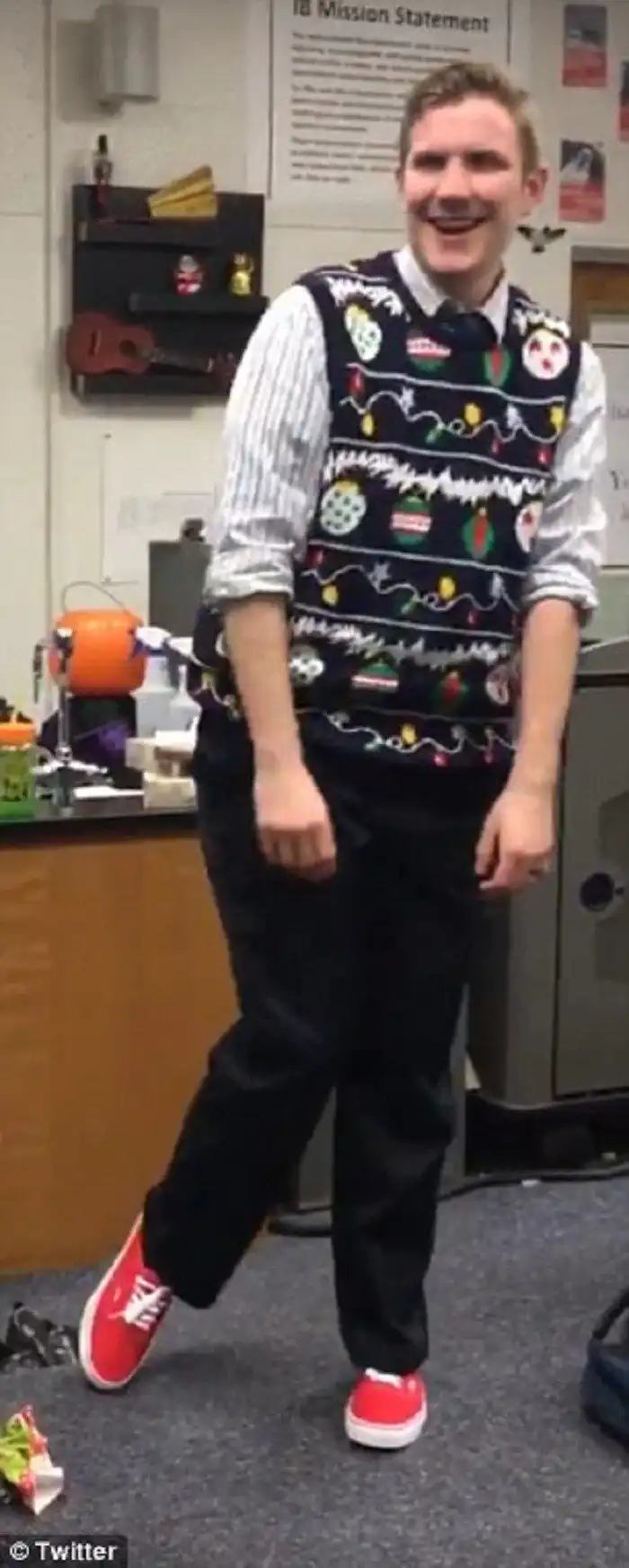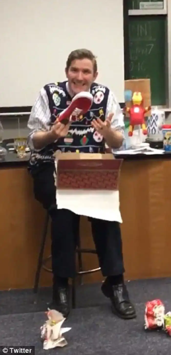 На видеозаписи Керби в вязаной жилетки веселой расцветки сидит на высоком стуле и открывает коробку с подарком, врученную ему учениками. "О, боже!" - восхищенно ахает он, вытащив из коробки один ботинок. Школьники невольно улыбаются, видя, как учитель рад купленным для него классическим кедам Vans со шнуровкой.