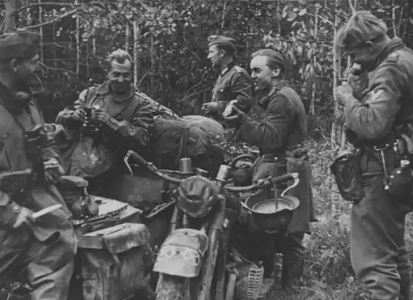 Немецкие мотоциклисты у леса на Восточном фронте. 1941 год. BMW R-12.