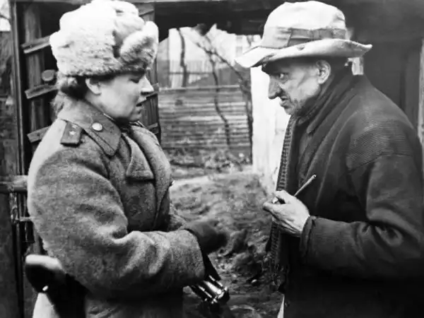 Представитель Ставки ВГК Маршал Советского Союза А.М. Василевский и командующий войсками 3-го Белорусского фронта И.Д. Черняховский допрашивают пленного командира 53-го армейского корпуса генерала пехоты Гольвинцера и командира 206-й пехотной дивизии генерал-лейтенанта Зитгера. Район Витебска, 1944 год.