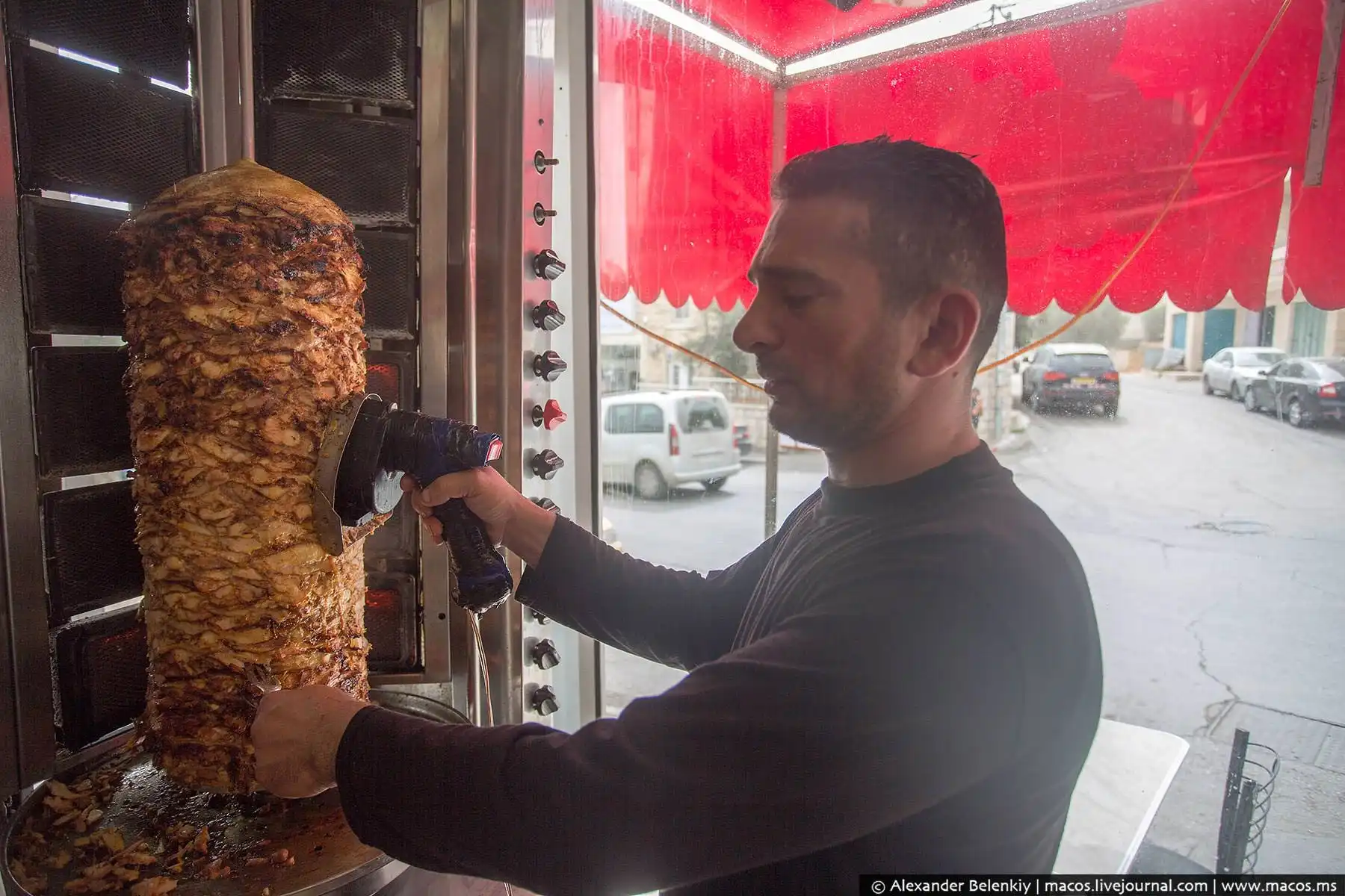 В разных местах очень по-разному, но бывают основные два вида шавармы, в пите или лаваше. В лаваше лучше, поскольку влезает больше. Намного больше! Самое вкусное место с шавармой мне попалось в пригороде Вифлеема, где живут арабы-христиане.