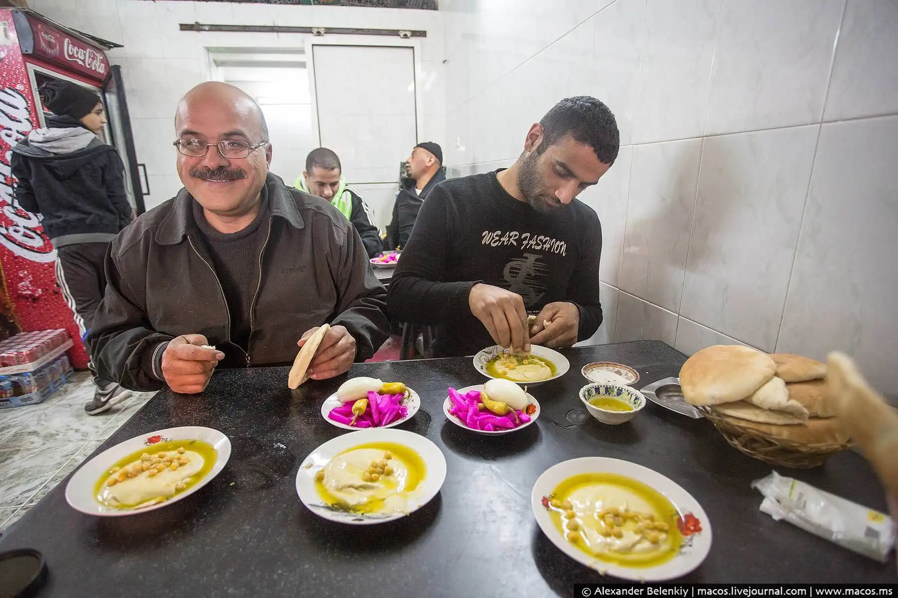 Кроме блюда с самим хумусом, вам дадут ещё несколько тарелочек с закусками. Обычно там как раз лук и другие маринованные овощи, у каждого владельца свой набор. Местные очень любят всякие соленья, так что солёные огурцы или маринованная капуста - непременный рацион. На фотографии Ахмад (слева) и Юзеф, которые помогали мне путешествовать по Палестине.