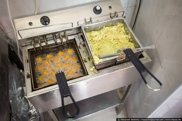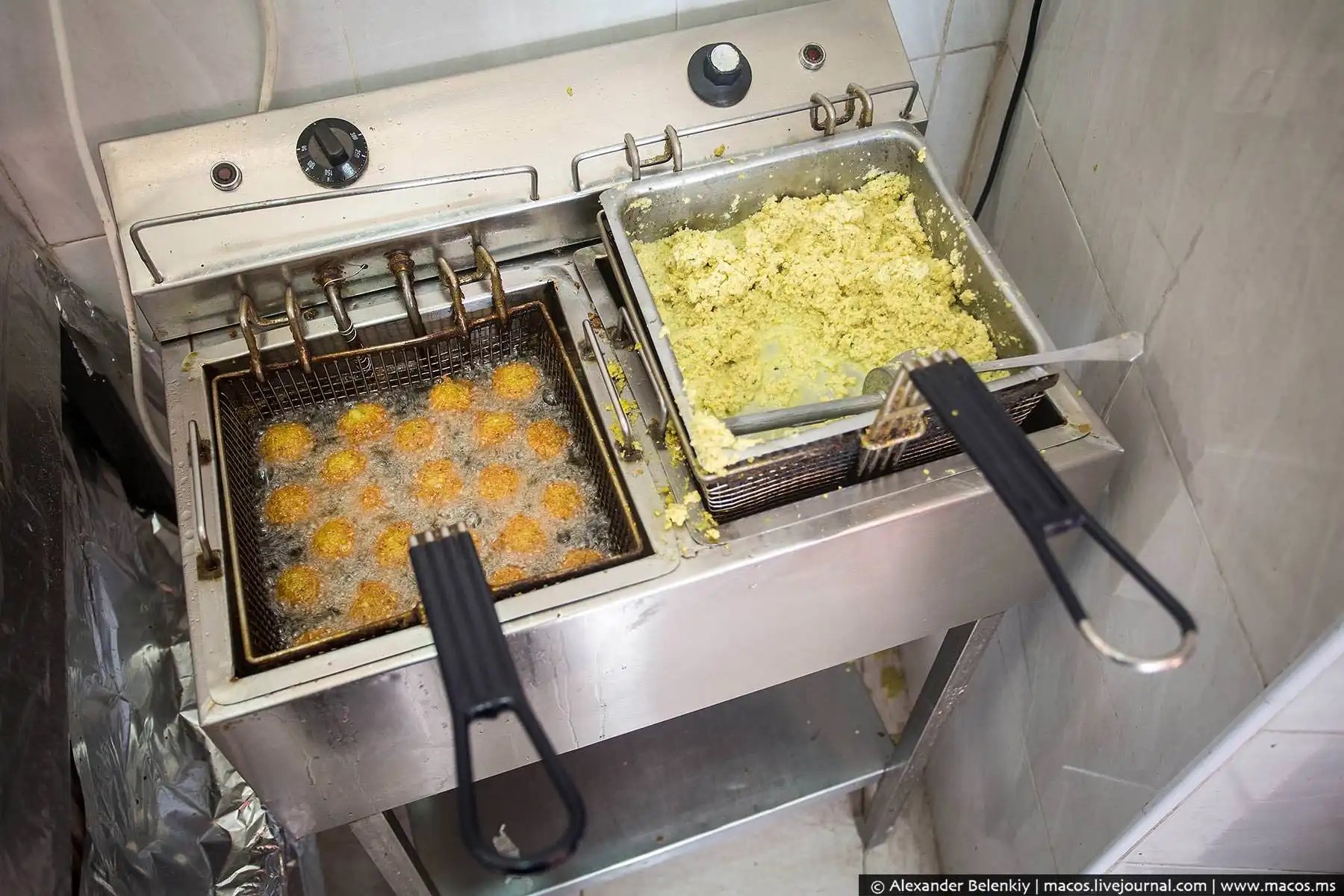 Вторая по популярности еда здешних мест - фалафель. Ударение на второй слог, хотя фалафЕль звучит интереснее :) Интересно, что фалафель состоит из тех же самых ингридиентов, что и хумус, то есть из измельчённого нута, турецкого гороха. Только способ приготовления другой, в виде шариков, которые жарят во фритюре.