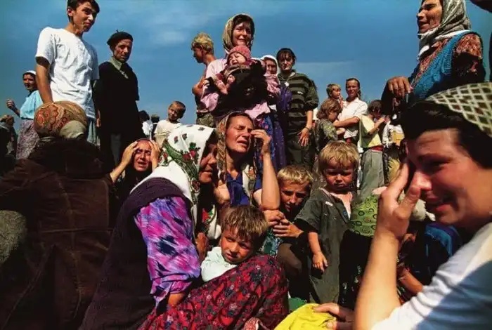 В другом примере геноцида, осуществляемом как против этнической (боснийской), так и религиозной (мусульманской) группы, мы видим, как люди реагируют на боль, ужас и смерть. Эти женщины потеряли членов своих семей в геноциде во время боснийской войны после распада бывшей Югославии. Опять же, это было не так уж и давно, в начале 90-ых, что доказывает, что человечество не такое уж просвещенное и прогрессивное, как делает вид. По меньшей мере 100000 человек погибли, когда боснийские сербы и бывшая югославская армия, контролируемая ими, начали спонсируемую государством программу насилия и убийств. Сотням сербов, в том числе президенту Слободану Милошевичу, впоследствии были предъявлены обвинения в совершении военных преступлений и преступлений против человечности. Милошевич не сделал вообще ничего, чтобы помочь этим семьям. Возможно, самым поразительным на этой фотографии является почти полное отсутствие мужчин; это только плачущие женщины и дети, вынуждены столкнуться с ужасным новым миром.