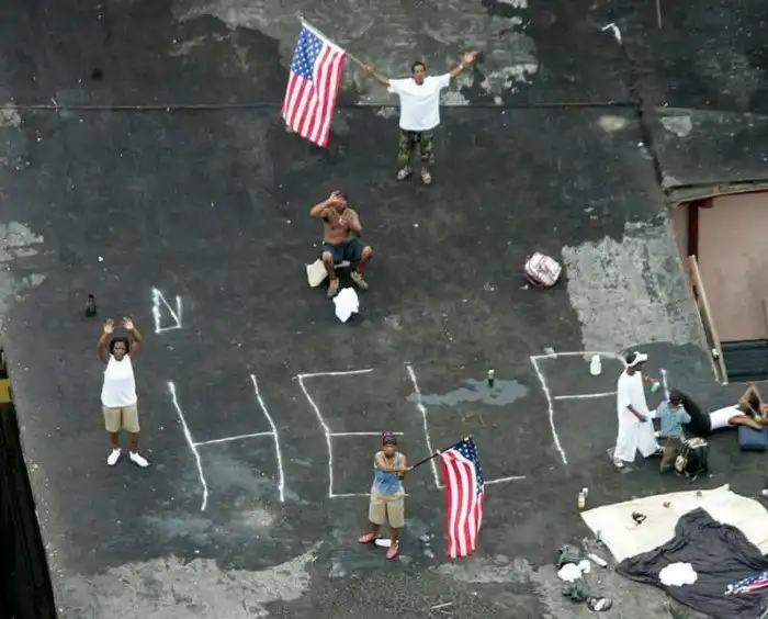 Что происходит, когда кошмарный ураган ударяет по восточному побережью и, в частности, по Нью-Орлеану? Ну, на этом фото вы можете увидеть, как обычные средние американские граждане оказались в затруднительном положении — без пищи и крова, они стоят на крыше здания и ждут помощи. Сделали ли власти США действительно все возможное, чтобы спасти этих и других людей, и было ли это сделано своевременно? Общественное мнение таково: «Нет, они не сделали." Что реально пугающе на этом фото, так это то, что люди с американскими флагами надеятся на власти, и что они будут спасены. Но с большинством из них этого не произошло...это по-настоящему ужасно: знать, что все они погибли.