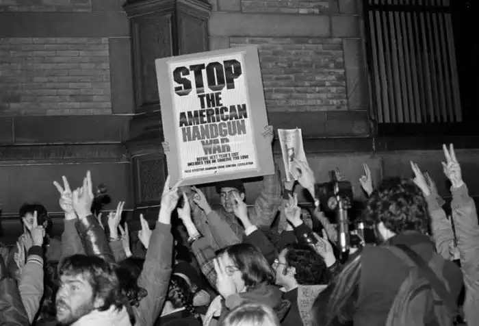 Что особенно ужасно на этом фото, однако, что все эти люди в кадре протестуют против ношения оружия и показывают символ мира. Леннон был застрелен в 1980 году... Задумайтесь, как далеко мы от мира в наших городах сегодня, более чем 35 лет спустя.