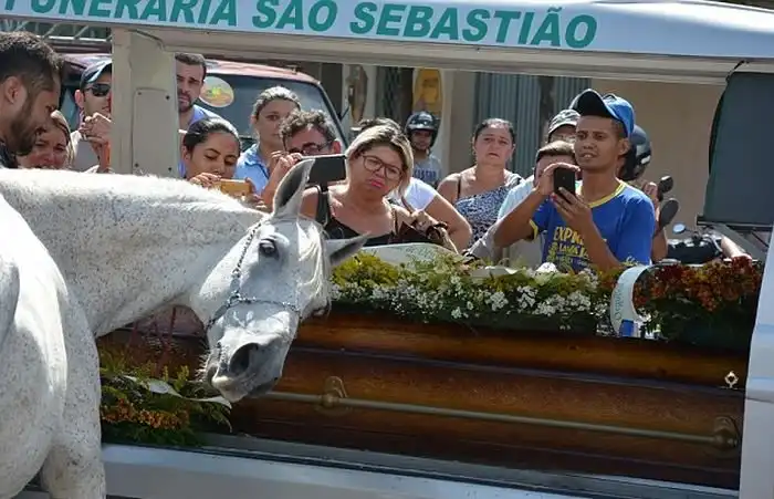 Эти трогательные фотографии были сделаны в Бразилии на похоронах 34-летнего Вагнера де Лима Фигейредо (Wagner de Lima Figueiredo), разбившегося на мотоцикле. Попрощаться с мужчиной помимо родственников и друзей пришла и его лошадь по кличке Серено. В течение 8 лет Вагнер и Серено выступали на родео, в результате чего у них сложились очень теплые отношения. По словам очевидцев, животное то «хныкало», то громко ржало, то топало ногами и клало голову на гроб своего хозяина.