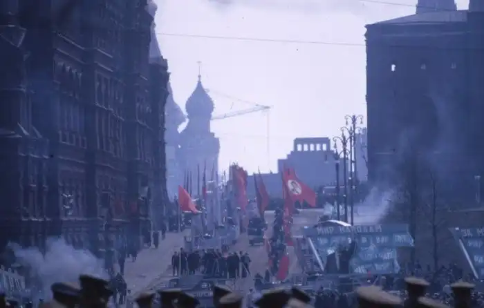 У нас есть великолепная возможность увидеть парад военной технике в Москве на Красной площади, глазами американского историка. Причем в достаточно неплохом качестве и цветном исполнении.