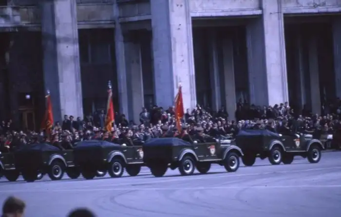 Проезжает колонна ГАЗ-69А. Активно использовался не только в армии, но и в МГБ, МВД, геологоразведке, лесном и сельском хозяйстве и везде, где был нужен простой полноприводной автомобиль.