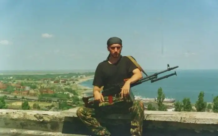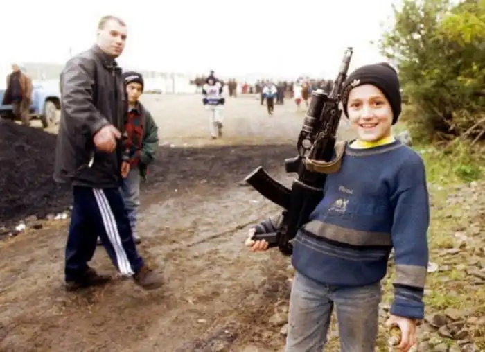 Чеченский мальчик с автоматом в лагере для беженцев. Ингушетия, ноябрь 1999 года.
