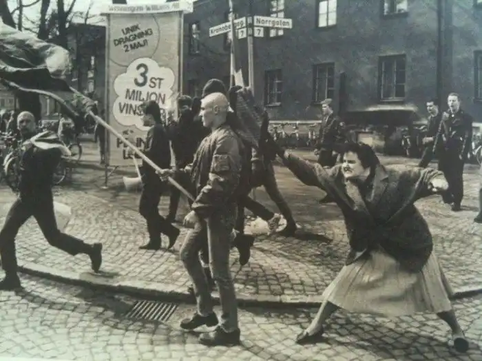 Шведка ударила сумкой протестующего неонациста. Эта женщина выжила после заключения в концлагере (1985).