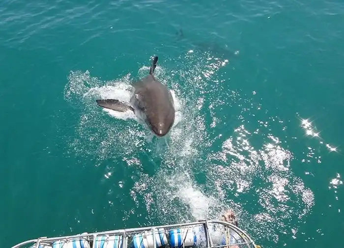 Огромную белую акулу сфотографировали у берегов ЮАР пассажиры небольшой туристической яхты, которые вышли в море, чтобы взглянуть на одного из самых опасных в мире хищников. В какой-то момент приманкой, которая тащила за собой яхта, заинтересовалась 4-метровая акула, которая стала выпрыгивать из воды, пытаясь схватить добычу. Находящиеся на борту туристы не могли упустить столь подходящий момент и сделали эти замечательные снимки.