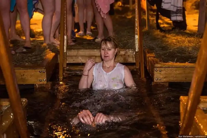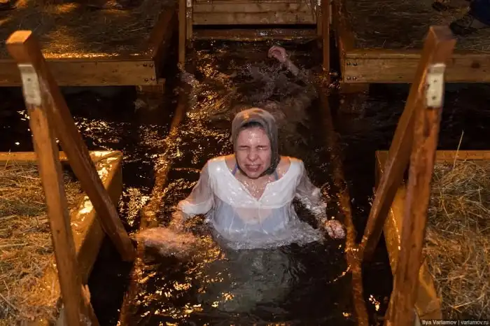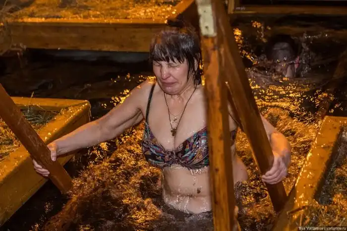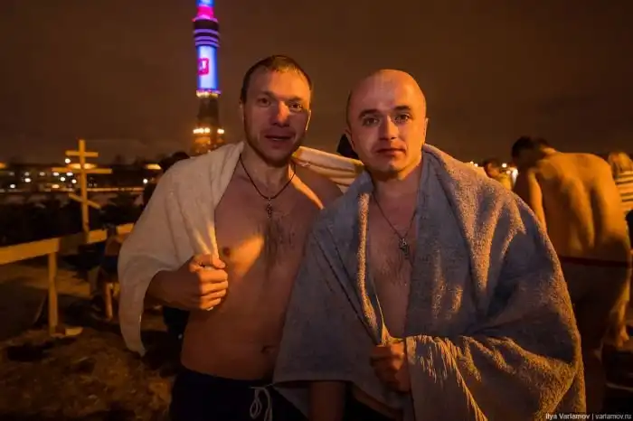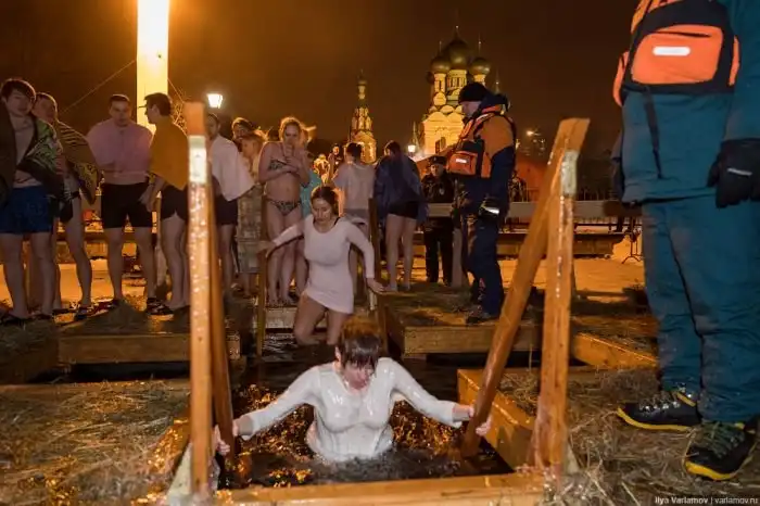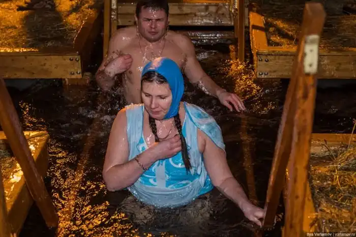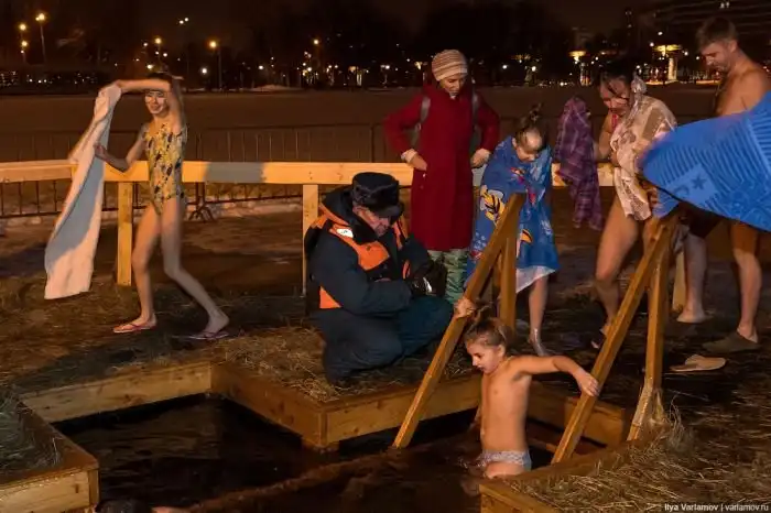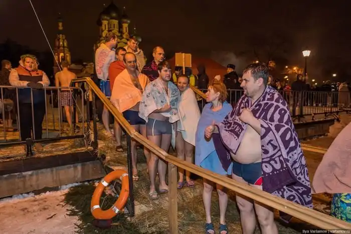 В последние годы крещенские купания становятся все более популярными среди россиян. Несмотря на морозы, желающие окунуться в ледяную воду находятся и в больших городах и в селах, причем из года в год в обряде все чаще принимает участие молодежь. Далее хотим показать вам, как проходили купания в одной из 59 купелей Москвы. Фото сделаны у купели в Северо-Восточном округе Москвы в Дворцовом пруду (он же Останкинский).