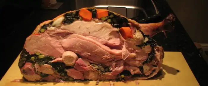 Этот апофеоз американской кулинарии мы специально оставили «на сладкое». Turducken, а именно так называется это блюдо, состоит из трех слов, они же — главные ингредиенты: turkey (индейка), duck (утка) и chicken (курица). Для того чтобы приготовить этот шедевр, надо курицу засунуть в утку, которую, в свою очередь, надо засунуть в индейку. Как и, главное, зачем они это делают, мы боимся даже представлять.