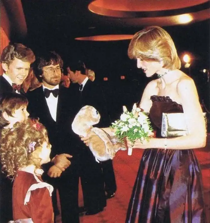 Дрю Бэрримор и компания ( Генри Томас, Роберт Макнотон и Стивен Спилберг) дарит принцессе Диане игрушку-инопланетянина на лондонской премьере фильма "Инопланетянин", 1982 год.