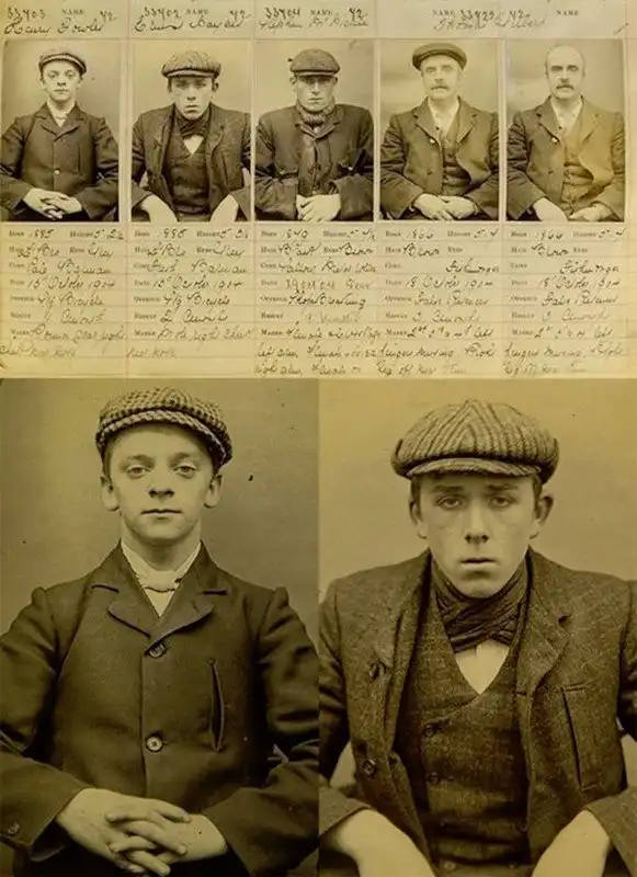 Члены банды "Острые козырьки", 1900–е годы, Бирмингем Банда получила название за привычку вшивать лезвия в козырьки кепок, дабы использовать оные в качестве оружия. Но есть вероятность, это и байка, а термин peaky blinders использовался просто в каче