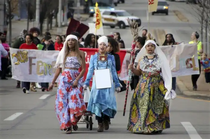 Три женщины возглавляют группу протестующих из района Ист-Либерти, Питтсбург.
