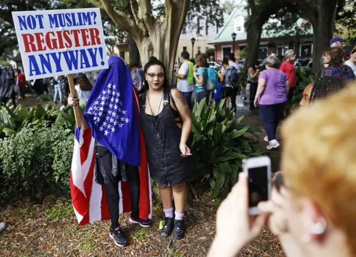 Женщина в бурке из американского флага позирует в парке Вашингтон-Сквер. Надпись на плакате: "Не мусульманин? Все равно регистрируйся!"
