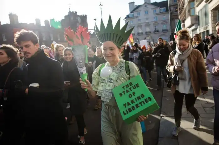 Протестующая в костюме статуи Свободы идет с колонной, движущейся от посольства США на площади Гросвенор по направлению к Трафальгарской площади.