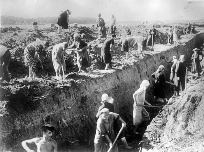 Жительницы прифронтовых деревень строят оборонительные сооружения. Июль 1941 года.