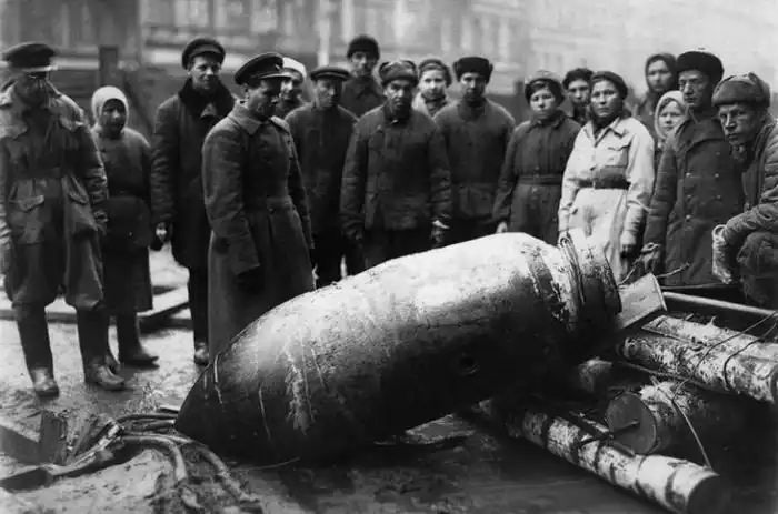 Ленинградцы разглядывают неразорвавшуюся и обезвреженную саперами немецкую авиабомбу.