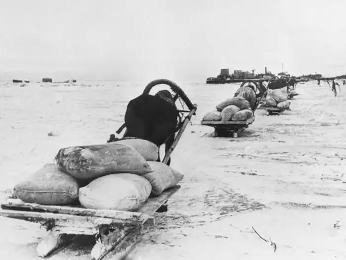 Санный обоз отправляется в блокадный Ленинград по льду Ладожского озера.