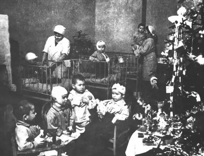 Палата детской больницы с новогодней елкой в блокадном Ленинграде. Зима 1941-1942 годов.