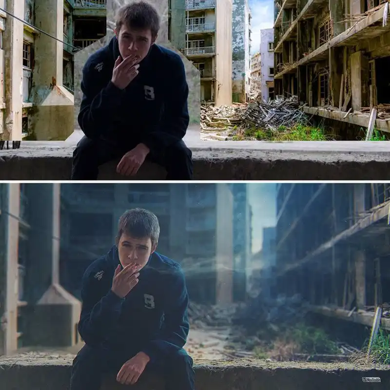 Макс Асабин, компьютерный дизайнер из России, накладывает несколько изображений друг на друга так, что линии слияния нигде не видны, и превращает их в одну невероятную картину. Для этого он тщательно обрабатывает края каждой верхней картинки, добавляет тени и световые эффекты и подгоняет цвета, чтобы все выглядело стопроцентно реалистично. С помощью своей техники он может поместить кого угодно в центр одной из захватывающих дух сцен.