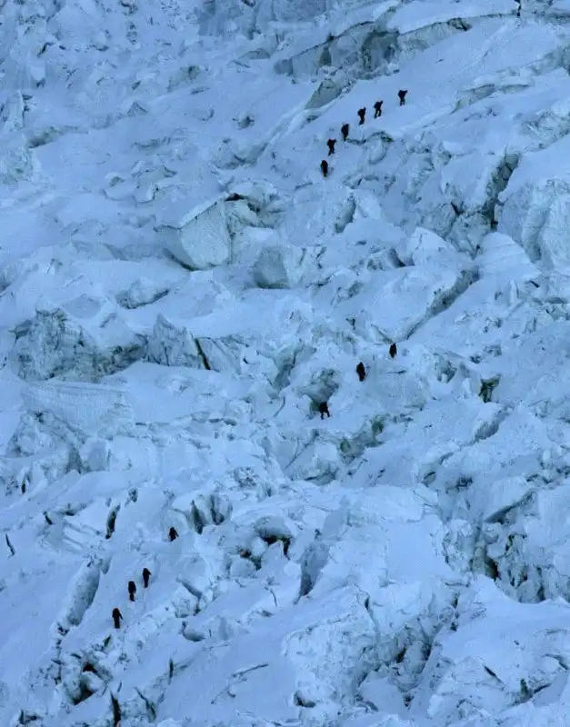 Альпинисты из разных стран спускаются ледопадом Кхумбу на обратном пути в базовый лагерь 22 мая 2013 года после успешного покорения Эвереста. Май является самым популярным месяцем для поднятия на Эверест из-за более благоприятной погоды