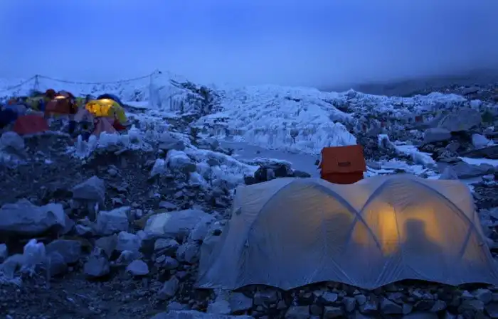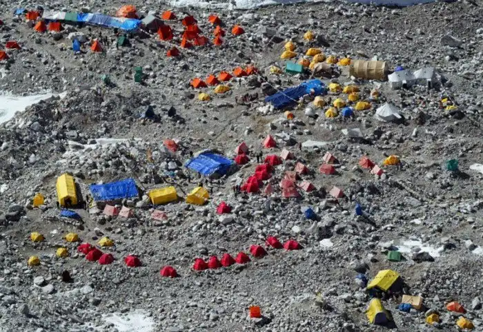 Аэрофотосъемка Базового лагеря возле Эвереста, большого палаточного городка на высоте 5486 метра 15 мая 2003 года. Около 1000 альпинистов планируют покорить вершину в честь 50-летия успешного восхождения на Эверест