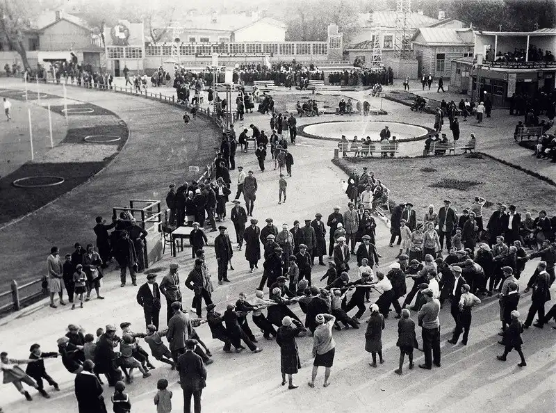 «ОТКРЫТИЕ СТАДИОНА СКиГ /союза работников кооперации и госторговли/ Самарский пер. 22, состоялось 22/V-32 г. В программе: товарищеские встречи спортсменов СКИГ с командами строителей 24-го завода и др. На снимке: массовые детские игры. Перетягивание каната. Москва, мая 1932 г.»