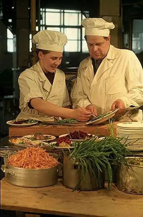 В заводской столовой.