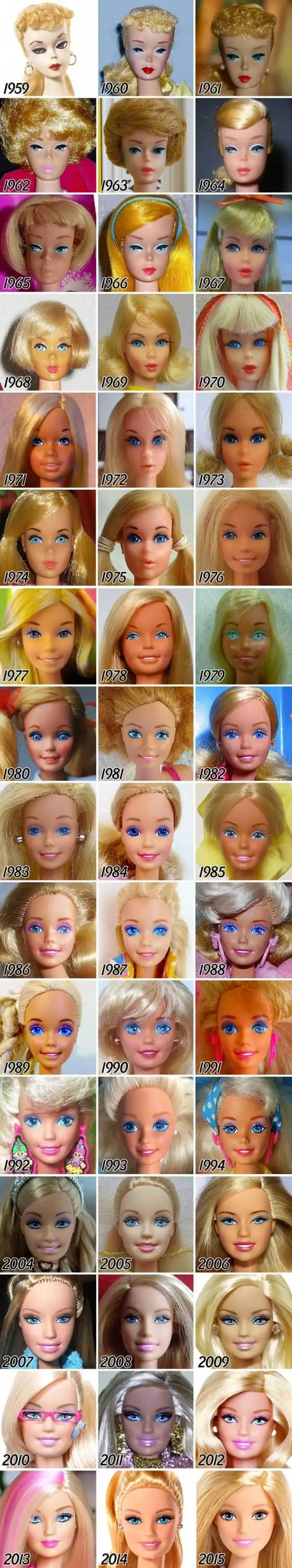 Всемирно известная и любимая всеми кукла Барби менялась вместе с тем, как менялось и представление об идеалах красоты. Далее предлагаем взглянуть на то, как менялся вид популярной куклы с 1959 по 2017 год.