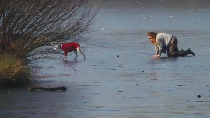 Хозяйка со своим питомцем прогуливалась по окрестностям озера Чингфорд (Эссекс, Англия), когда ее пес, увидев уток на воде, побежал по тонкому льду. Веса пса было достаточно, чтобы лед проломился под ним. Но хозяйка не бросила своего питомца в беде и рискнула самостоятельно выйти на лед для его спасения. К счастью, все закончилось благополучно.
