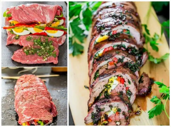 Мясной рулет (говядина) - отрезать тонко, положить начинку, завернуть, запечь