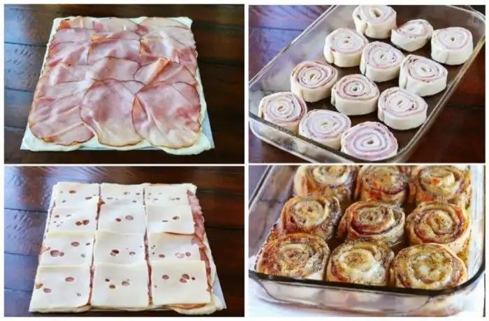 Тесто или лаваш, выложить сверху сыр, бекон или ветчину, нарезать рулетами, запечь
