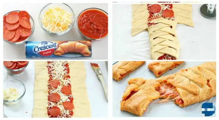 Тесто любое несладкое, кетчуп, колбаса сыр - разложить, нарезать по краям, сложить косичкой, запечь
