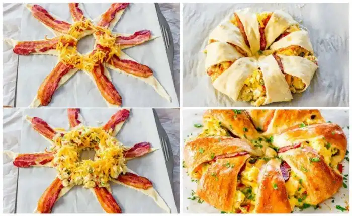 Тесто нарезать "звездочкой", выложить бекон, сыр, зелень, мягкий сыр или брынзу, завернуть, запечь