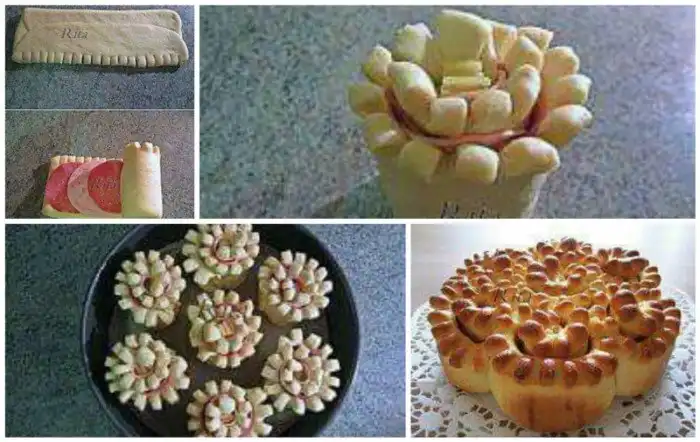 Колбасу завернуть в тесто, нарезать края, выложить в форму, запечь