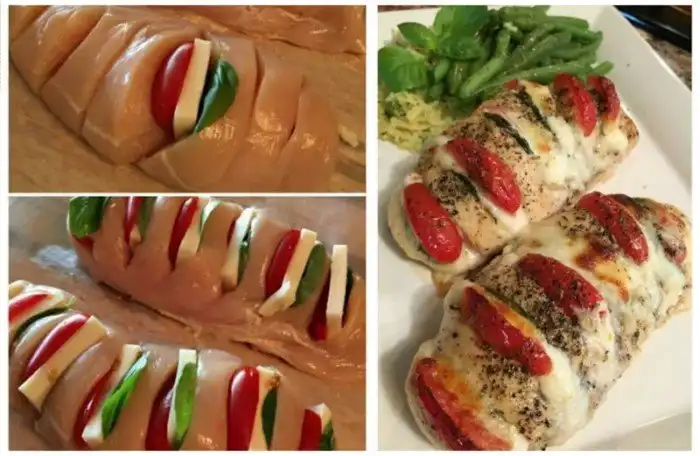 Куриную грудку нарезать полосками (не до конца, "гармошкой"), вложить томаты, зелень, сыр, запечь