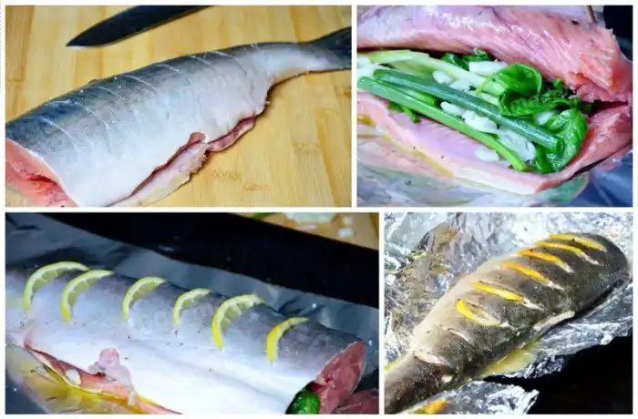 Горбуша - почистить, сделать разрезы по бокам, в брюшко вложить овощей, запечь в фольге. Можно всю рыбу обмазать майонезом (сметаной) с зеленью и приправами - будет еще сочнее.